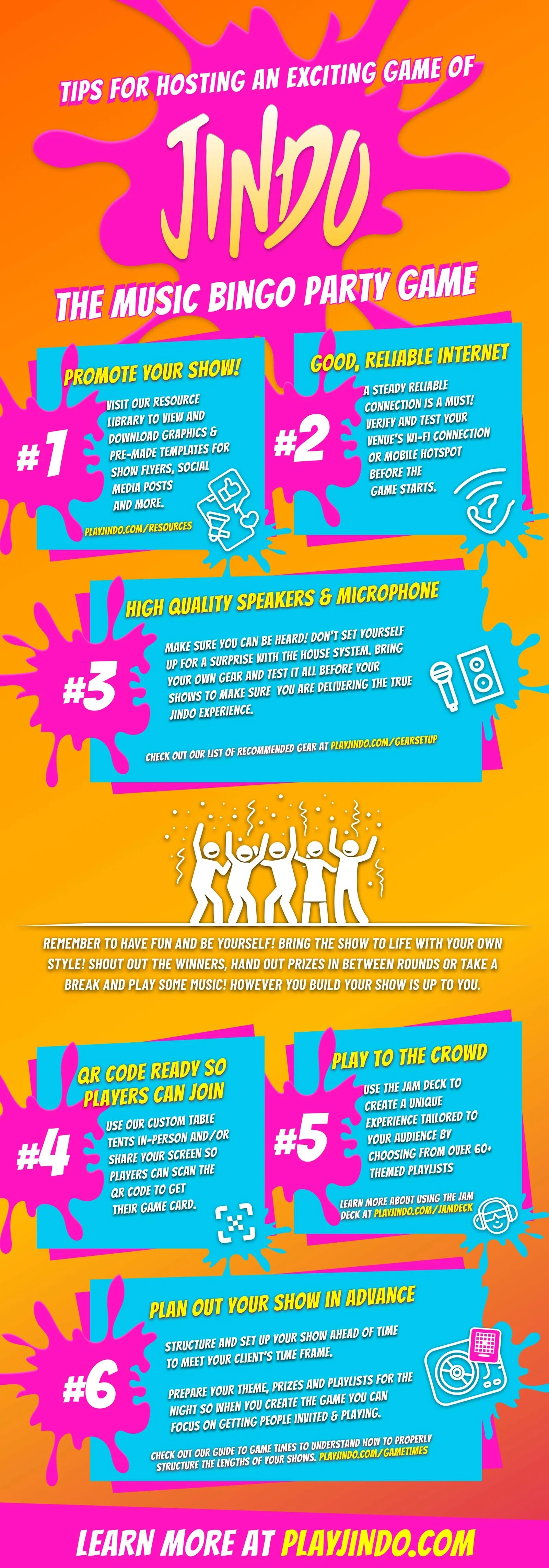 Jindo is the simplest way to create and host your own music bingo party game. Use the Jindo Jam Deck and these basic tips to make sure that your show is awesome!